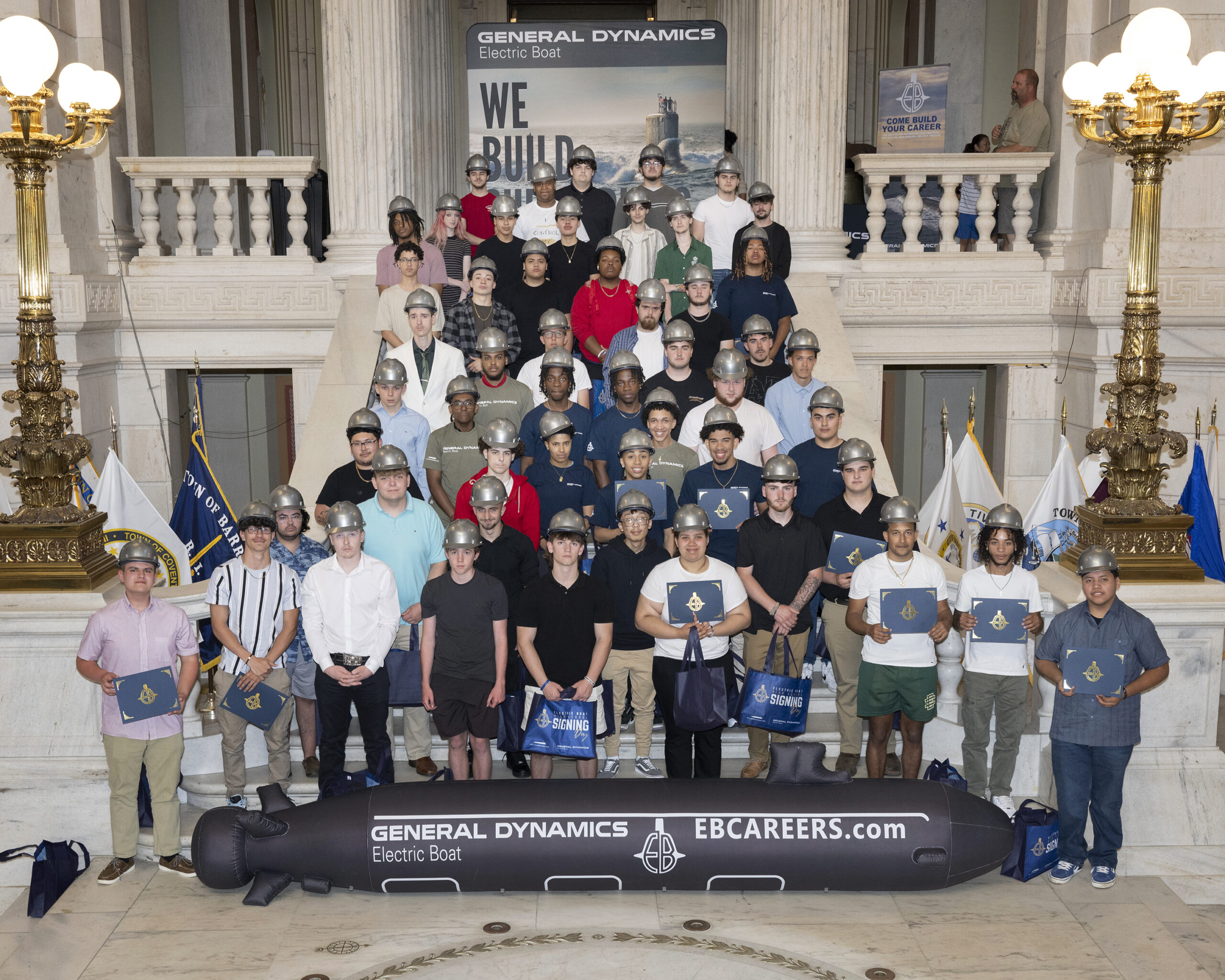 In Rhode Island, Signing Day was held at the Rhode Island State House for students from 36 high schools across Connecticut, Rhode Island, Massachusetts and New Jersey. One hundred seventy nine signees were recognized, who will each join the EB team at the Quonset Point facility. Students heard from Joe Shekarchi, Rhode Island State Representative and Speaker of the House; EB’s Mark Rayha, Senior Vice President, Chief Operating Officer and Chief Financial Officer; Sen. Jack Reed; Sen. Sheldon Whitehouse; Rep. Seth Magaziner; Rep. Gabe Amo; Angelica Infante-Green, Rhode Island Commissioner of Elementary and Secondary Education; Dr. Javier Montanez, Providence Public Schools Superintendent and Navy representatives. “At the end of the day, you’ll know the rewards of having created something with your hands. And, to be honest, it’s hard work. But, if you put in the effort, you’ll learn, grow and know the satisfaction that comes from doing work that matters,” said Rayha in his welcoming remarks. The RI Signing Day Award was given to Providence Career and Technical High School, with 15% of their senior class going to Quonset Point.