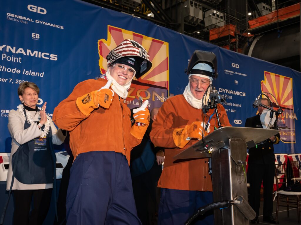 Electric Boat President Kevin Graney recognized Quonset Point employees Kyle Goff, Chris Barnes and Meadow McCarron for their significant contributions to PCU Arizona during the early stages of her construction, as well as EB’s Distinguished Shipbuilders with 40-plus-years of service to Electric Boat. In expressing the significance of SSN 803 Arizona, Graney stated, “The crew who serve on this ship will forever honor the memory of those who served on BB 39. They will do so, fittingly,” he continued, “on a ship uniquely prepared to enhance the reach of America’s warfighters and to preserve our nation’s freedom.”