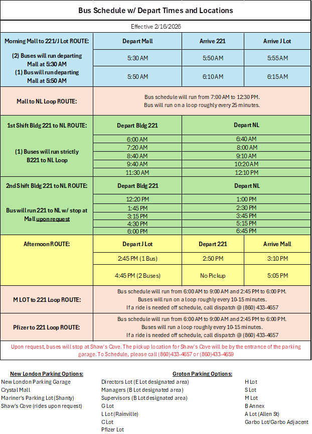 Buses will run from Pfizer to B221 from 6:00 AM to 9:00 AM and 2:45 PM to 6:00 PM on a loop every 10-15 minutes. If a ride is needed off schedule, employees can call dispatch at (860) 433-4657.