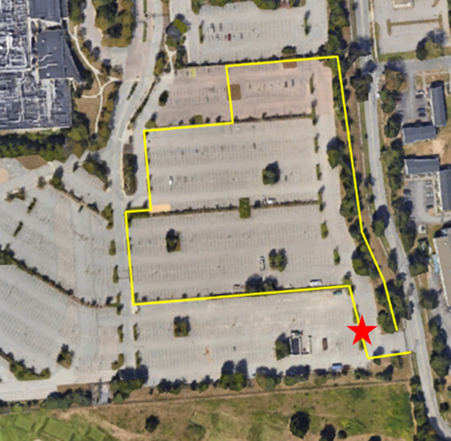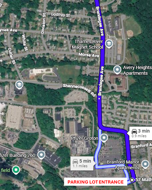 Beginning Monday, February 16, there will be 690 open parking spaces available on the Pfizer campus located on Shennecossett Rd., Groton, CT 06340. The spaces are indicated in yellow on the map below. The red star indicates the bus pick-up location.