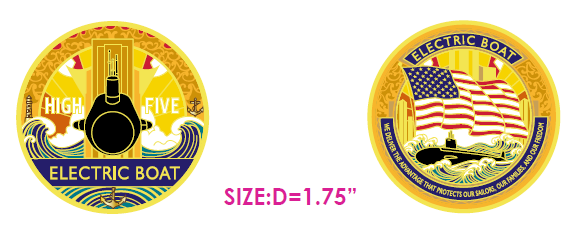 Cheyne’s design was inspired by how picturesque the shipyard can be at sunrise. “The geometric shapes in the background imitate the large buildings in the shipyard, and the colors are a representation of what I see every morning when leaving third shift. I wanted the centerpiece of the coin to be the submarine and modeled it after the shape of the EB bug, where the letters E and B form the shape of a submarine. I also wanted the American flag to be prominent on the coin because it represents the reason why we do all that we do here at EB,” said Cheyne.